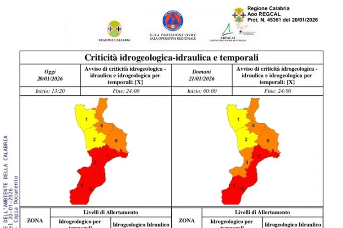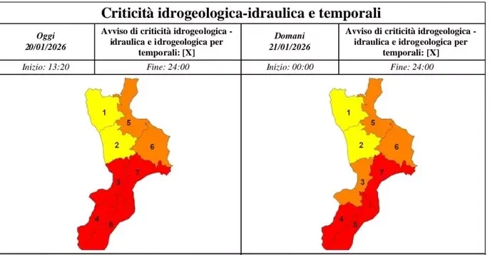Sulla base delle previsioni del centro Arpacal, la Protezione civile regionale ha diffuso un’allerta rossa per la fascia ionica catanzarese e per tutta la provincia reggina; arancione per la fascia ionica cosentina e crotonese e quella tirrenica catanzarese e vibonese; gialla sul resto della regione.