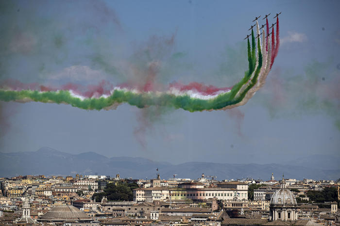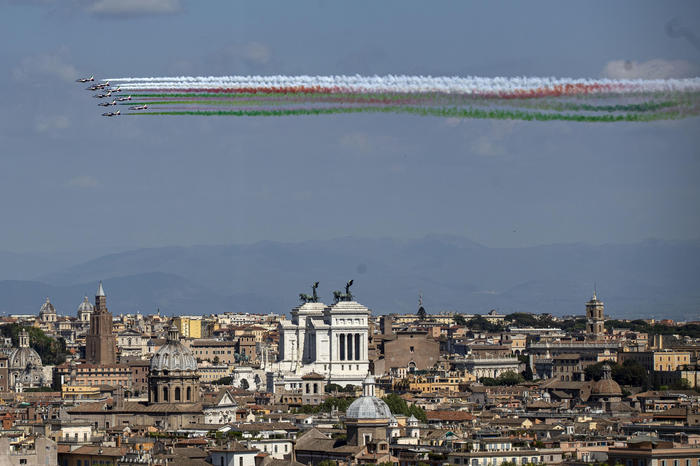 25 APRILE, LE FRECCE TRICOLORI IN VOLO SU UNA ROMA DESERTA