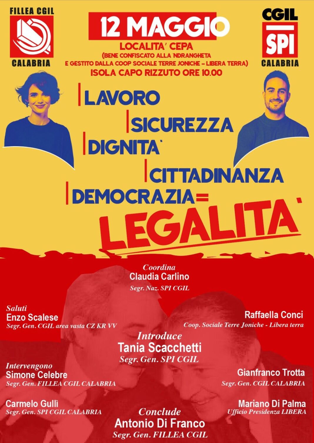 Lunedì 12 maggio 2025 alle ore 10.00 si terrà a Isola Capo Rizzuto, in località Cepa, in un bene confiscato alla ‘ndrangheta e affidato alla Cooperativa Sociale Terre Joniche, Cgil, Spi Cgil e Fillea Cgil promuovono l’iniziativa “Lavoro + Sicurezza + Dignità + Cittadinanza + Democrazia = Legalità”.