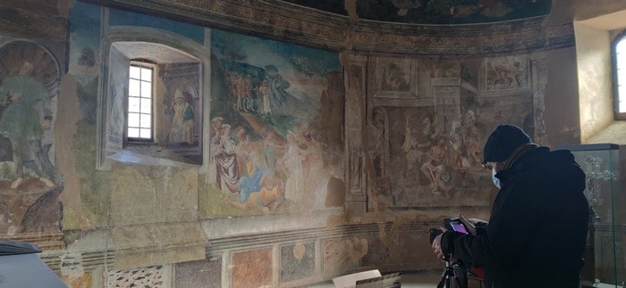 Muove i primi passi lo studio archeometrico degli affreschi di Saturnino Gatti nella chiesa di San Panfilo a Villagrande di Tornimparte. Nel paese a venti minuti dall’Aquila nei prossimi mesi si alterneranno fisici, chimici, geologi, archeologi, biologi e ingegneri per indagini tecnico-scientifiche sull’opera realizzata tra 1491 e 1494. Il primo gruppo di lavoro si è occupato del rilievo fotogrammetrico digitale per documentare lo stato di conservazione del manufatto architettonico e delle pitture. Si procede ora ad analisi del microclima e verifica del livello di inerzia dell’edificio. Operazioni previste dalla Convenzione Scientifica stipulata il 23 novembre 2020 dall’Associazione Italiana di Archeometria (Aiar) con il Segretariato regionale del MiBact per l’Abruzzo, in collaborazione con Soprintendenza Archeologia, Belle Arti e Paesaggio per la Città dell’Aquila e i comuni del Cratere. Prossime tappe: mappatura aree di rifacimento e identificazione dei materiali di restauro sovrapposti negli interventi conservativi; caratterizzazione dei materiali originali di stesure a fresco e finiture a secco; identificazione della tecnica esecutiva propria di Saturnino Gatti e delle modalità di organizzazione del cantiere quattrocentesco; documentazione, mappatura e comprensione dei fenomeni di degrado di superfici pittoriche e strutture architettoniche. “Terminati i rilievi fotogrammetrici che hanno permesso di definire il modello 3d – spiega Mauro La Russa, presidente di Aiar, professore associato di Petrografia applicata ai Beni Culturali all’Università della Calabria, Dipartimento di Biologia, Ecologia e Scienze della Terra – Seguiranno analisi non distruttive per caratterizzare i materiali pittorici e il loro stato di conservazione. Poi si passerà a campionamento e analisi in laboratorio”. “La chiesa di S.Panfilo con il ciclo di affreschi di Saturnino Gatti è il nostro gioiello – commenta il sindaco di Tornimparte Giacomo Carnicelli – E’ una tappa del Cammino francescano ‘Con le ali ai piedi’, quindi forte elemento di attrazione per i turisti. Questo lavoro dell’Aiar per noi è una straordinaria occasione di promozione”.