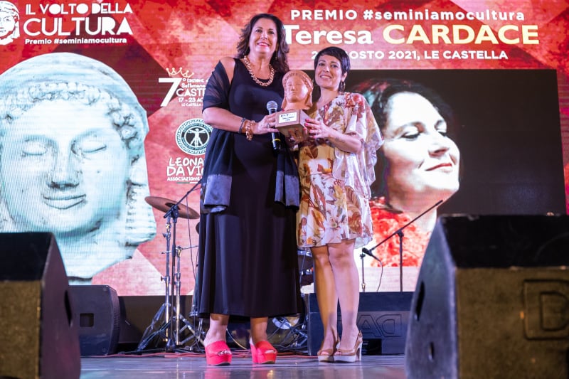 Una estate molto impegnativa e ricca di successi e riconoscimenti, che vede protagonista il soprano crotonese Teresa Cardace. La Cardace, ormai eccellenza della lirica, è una delle sei personalità che domenica scorsa, nella piazza Uccialí adiacente al Castello di Le Castella, ha ricevuto il prestigioso riconoscimento “Il volto della Cultura”, nell’ambito della “settimana della cultura” organizzata dalla Associazione “Leonardo da Vinci”, finanziata dalla Regione Calabria e patrocinata dal comune di Isola Capo Rizzuto. “Il volto della Cultura”, una preziosa opera d’arte in terracotta realizzata dal M°Elio Malena e raffigurante la testa di Medma, quale riconoscimento per il costante e proficuo impegno di promozione culturale operato sul territorio calabrese, distinguendosi in Italia, portando la sua arte musicale e la sua calabresità anche all’estero con grande consenso di pubblico e di critica. Il soprano crotonese è appena rientrata da una fortunatissima tournée in Grecia, dove è definita “la Diva della Magna Graecia” e invitata annualmente a rappresentare, con il suo canto, la cultura musicale italiana. Un successo il tour di concerti che l’hanno vista protagonista raffinata in prime esecuzioni mondiali, tra cui spicca, presso il Castello Bizantino di Fanari, nel cuore della Tessaglia, l’esecuzione di “Anima Aeterna”, cantata per soprano, tenore, coro e orchestra di Iossif Valette, diretta da Nikos Efthimiadis e nella quale rappresentava Beatrice, nell’ambito delle celebrazioni mondiali in occasione del VII Centenario della morte di Dante Alighieri, ospiti del 39°Festival Internazionale di Musica Classica di Karditsa.