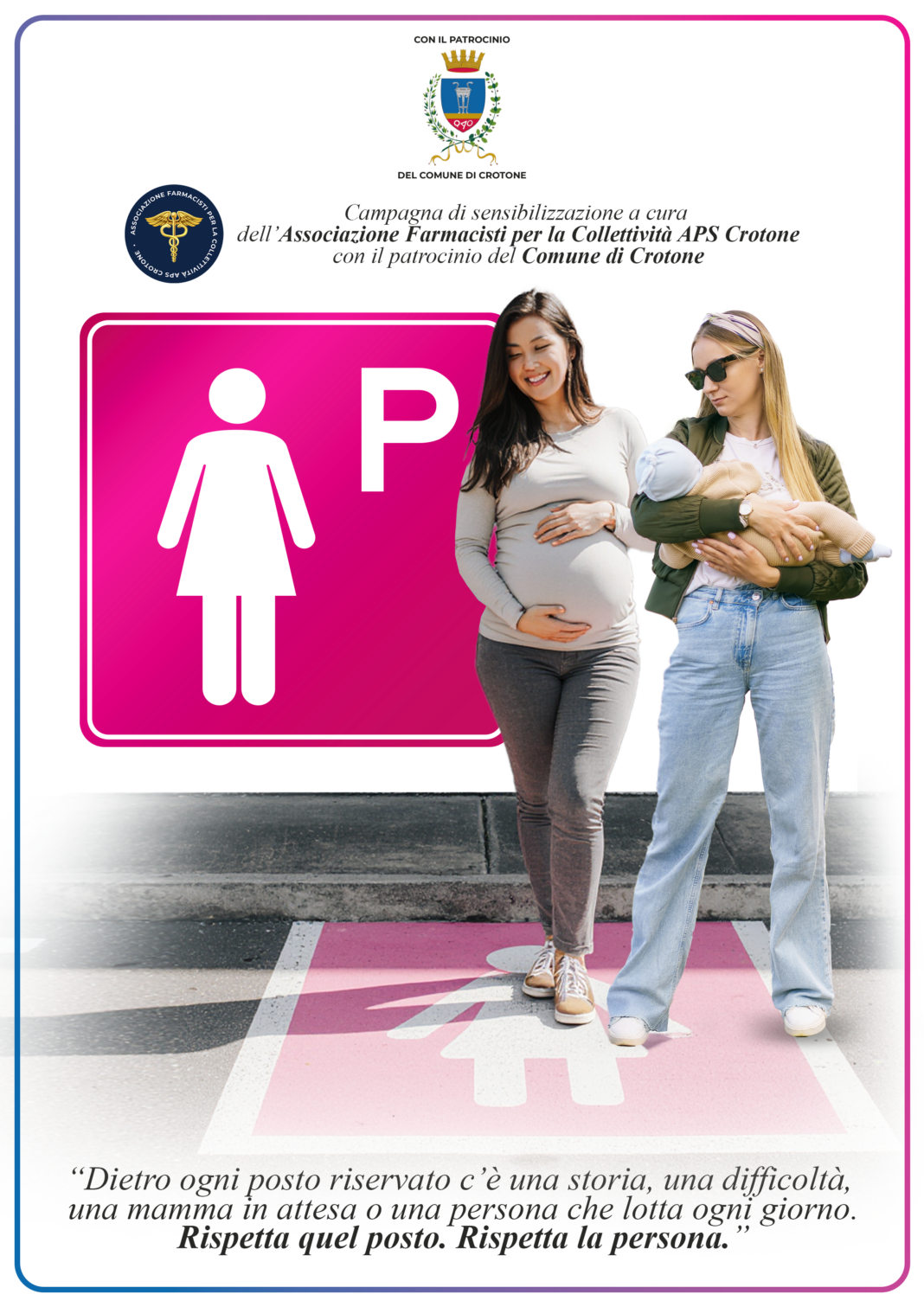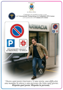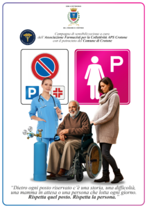 L’iniziativa – realizzata in collaborazione con Agifar Crotone – ha come obiettivo la promozione del senso civico e del rispetto verso le categorie più fragili della popolazione, in particolare in relazione all’uso corretto dei parcheggi riservati. La campagna mira infatti a sensibilizzare i cittadini sull’importanza di non occupare impropriamente gli spazi destinati a: