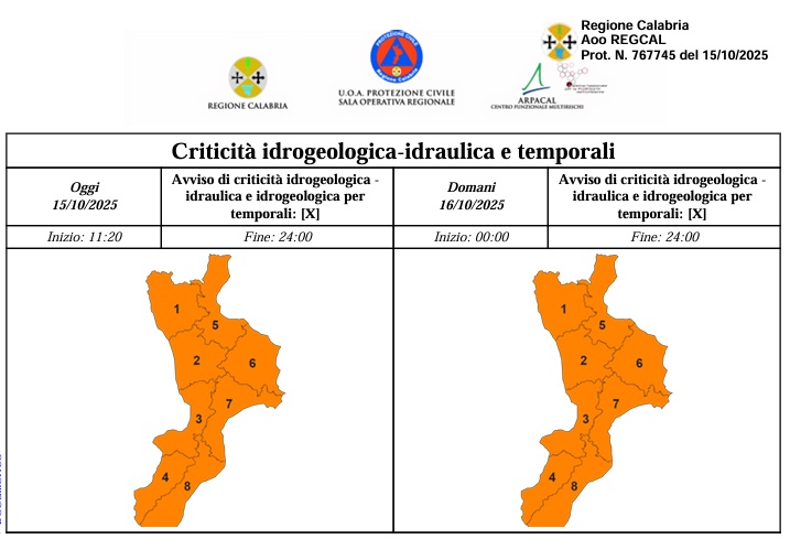 La Protezione civile della Regione Calabria ha diffuso un’allerta meteo arancione per oggi pomeriggio e domani su tutta la regione con l’indicazione di precipitazioni “da sparse a diffuse anche a carattere di rovescio o temporale” soprattutto sui settori meridionali e ionici accompagnati da “attività elettrica, grandinate e forti raffiche di vento”.
