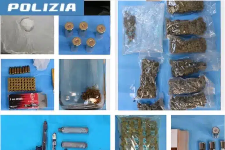 L’attenzione degli agenti si è poi concentrata su una cantina, dalla quale proveniva un forte odore di marijuana. Gli accertamenti hanno permesso di risalire al soggetto che aveva la disponibilità del locale. All’interno, la Polizia ha trovato un fucile a canne mozze privo di matricola; 10 cartucce calibro 12; 701,1 grammi di marijuana suddivisi in 8 involucri; 9,5 grammi di cocaina; materiale per pesare e confezionare la droga. In un’intercapedine del muro perimetrale di un edificio vicino, inoltre, è stato trovato un altro involucro di marijuana, 505,4 grammi, confezionato con lo stesso tipo di busta rinvenuto nella cantina. L’uomo è stato arrestato per detenzione di arma clandestina modificata, ricettazione, possesso abusivo di munizioni e detenzione ai fini di spaccio di sostanze stupefacenti.(ANSA)