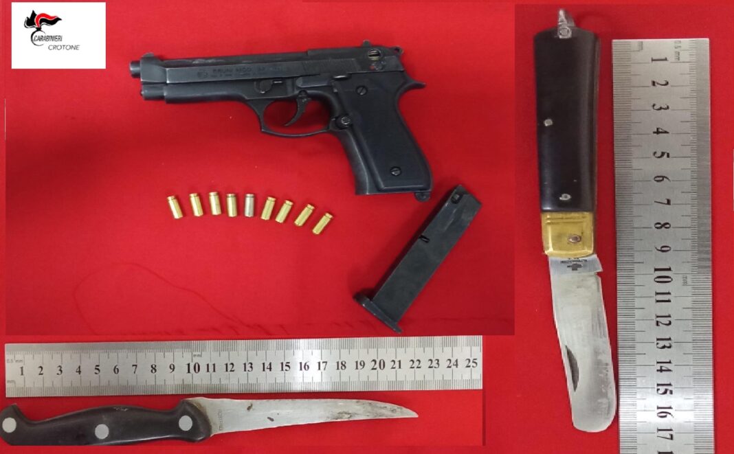 L’attività di ricerca ha consentito di rinvenire e sottoporre a sequestro due coltelli di cui uno con lama di 12 cm e l’altro – a serramanico – con lama di 7 cm, oltre ad una pistola giocattolo in metallo, marca “Bruni”, modello 92 calibro 8 mm, con tappo rosso e cane armato, completa di 9 proiettili a salve inesplosi.
