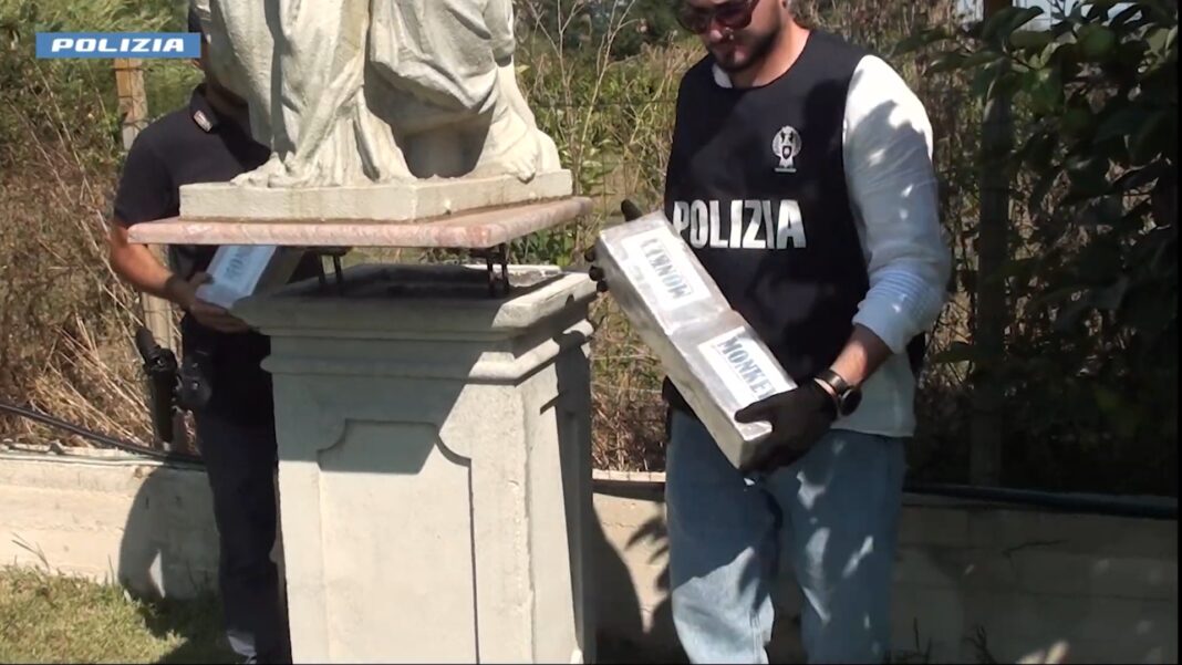 Durante l’attività di polizia giudiziaria, estesa anche nel giardino adiacente, è stata individuata una statua, realizzata con un particolare meccanismo di apertura e chiusura, al cui interno erano occultati ben 30 kg di cocaina.