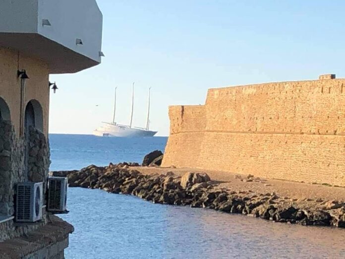 E’ stato avvistata stamattina a Le Castella il Sailing Yacht A, la barca a vela più grande al mondo. La nave si chiama semplicemente A (o Sailing Yacht A) ed è lunga 142,8 metri per oltre 12.600 tonnellate di stazza, ha un albero maestro di 90 metri e la parte emersa è alta come un palazzo di 8 piani. È stata progettata da Philippe Stark ed è costata 425 milioni di euro. Ospita al suo interno una grande piscina e un osservatorio subacqueo mentre uno dei ponti è attrezzato per l’atterraggio degli elicotteri. Spettacolare il suo passaggio dietro la fortezza aragonese a Le Castella, lungo le coste joniche, in un lungo viaggio nel Mediterraneo. [Foto Salvatore Frau]