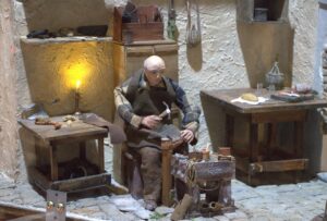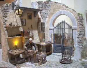 Entrambe, Ciccio e Rosa, sono due figure realizzate in terracotta e animate da motorini che li rendono degli autentici pastori in movimento, che il caro Enzo realizzò quando ancora era in vita e rese ancora più vive, dall’amore del figlio-artista. A fare da contorno alle sue opere ci sono stati presepi napoletani, presepi popolari, presepi storici, ulivi secolari, ruderi, templi diroccati, miniature, una mostra varia e suggestiva in cui sono stati raccontati borghi, scorci, tradizioni e antichi mestieri, riprodotti con cura secondo le tecniche della tradizione presepiale, trasformando ogni angolo in un messaggio di fede e memoria, vero strumento di evangelizzazione. Ogni artista ha fatto sì che attraverso la propria opera, si creasse un attimo di riflessione, per tornare alle origini, nel luogo dove silenzio e semplicità riconducono l’osservatore al senso autentico delle cose, al valore profondo di ciò che resta.