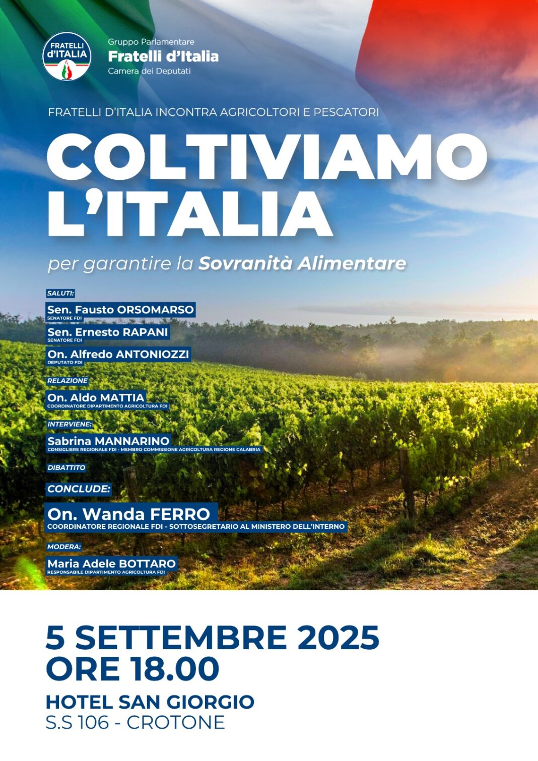 Si terrà a Crotone – venerdì 5 settembre 2025, alle ore 18.00, presso l’Hotel San Giorgio (S.S. 106) – una importante tappa dell’iniziativa nazionale “Coltiviamo l’Italia”, dedicata al confronto con agricoltori e pescatori del territorio.