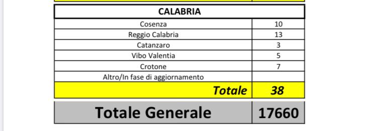 Le positività sono così suddivise per province: Cosenza (10), Reggio Calabria (13), Vibo Valentia (5), Catanzaro (3) e Crotone (7)