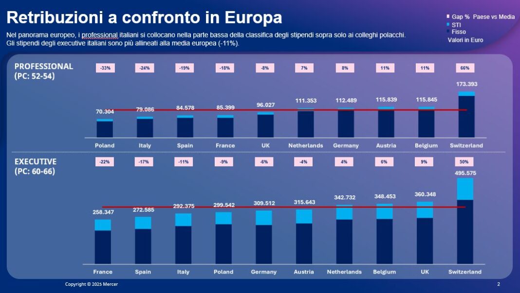 La retribuzione di ingresso dei neolaureati al primo impiego in Italia cresce, ma continua a scontare un forte ritardo competitivo nel confronto col resto d’Europa. È quanto emerge da una analisi di Mercer, una azienda di consulenza globale. L’indagine ha coinvolto 735 aziende operanti in Italia, osservando 270.000 retribuzioni. Nel 2025 la retribuzione media per un neolaureato al primo impiego si attesta a 32.000 euro. Il dato segnala un miglioramento significativo rispetto ai 30.500 del 2024. A livello settoriale, il Life Science si conferma il comparto più attrattivo. Seguono il Manufacturing, i Consumer Goods, l’High Tech e l’Energy. I servizi non finanziari restano invece il settore meno competitivo, con una retribuzione di ingresso pari a 28.400 euro. Nel confronto con l’Europa, però, l’Italia resta ancora poco competitiva. I neolaureati italiani si collocano nella parte bassa della classifica, davanti solo a Spagna e Polonia, che recentemente hanno cominciato ad accelerare. In testa alla classifica resta la Svizzera, con retribuzioni di ingresso prossime ai 90.000 euro annui, seguita da Austria e Germania, entrambe attorno ai 57.000 euro. «Con l’arrivo delle normative europee sulla Pay Transparency, trattenere e attrarre i giovani potrebbe diventare ancora più difficile», commenta Marco Valerio Morelli, amministratore delegato di Mercer Italia che fa parte della multinazionale Marsh. «Per questo è ancora più importante intervenire su tutto il perimetro, dai percorsi di carriera alla formazione continua, in modo da valorizzare al meglio il capitale umano fin dall’ingresso nel mondo del lavoro».