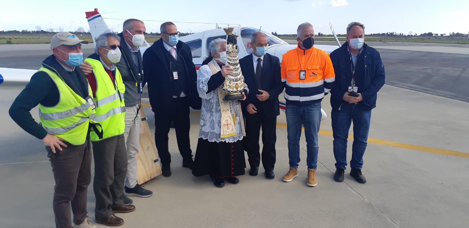 È atterrata alle 15 in punto, presso lo scalo Sant’Anna di Crotone, la sacra statua della Madonna di Loreto, protettrice di tutti gli aeronauti. Proveniente dal Tito Minniti di Reggio Calabria, la statua ha volato a bordo di un Piper Cherokee Archer comandato da Rino Sculco, vice presidente dell’Aero Club dello Stretto. Ad attendere la statua sul piazzale antistante l’aerostazione mons. Giuseppe Marra vicario del vescovo di Crotone e don Giovanni Barbara insieme con il direttore generale di Sacal Pier Vittorio Farabbi. La statua è stata posta all’ingresso dell’aerostazione pitagorica e vi resterà per una settimana fino al prossimo trasferimento verso lo scalo di Lamezia Terme. La statua della Madonna, su espressa richiesta della Sacal, con quello di Lamezia avrà toccato tutti e tre gli scali calabresi in un momento di particolare difficoltà per quanto riguarda il comparto aereo, uno dei segmenti maggiormente colpiti dalla pandemia.