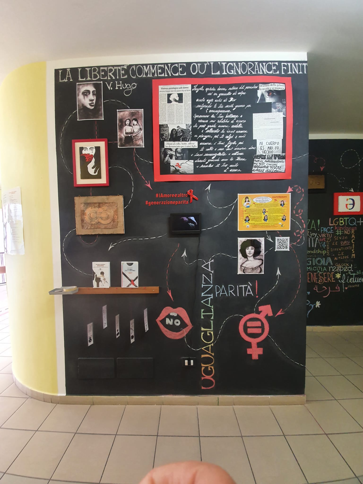 Un pomeriggio dedicato alla protezione di un video-racconto all’interno del Liceo Artistico di San Giovanni in Fiore tra sorrisi, calore e le riproduzioni di opere d’arte. #lamoreèaltro, il progetto di Educazione Civica trasversale a tutte le discipline che si è sviluppato nell’ambito del Progetto LiberaMente (progetto di inclusione, alla 5ª annualità) dell’istituto guidato dalla dirigente Angela Audia ha visto la partecipazione attiva di tutti dagli studenti, ai docenti, al personale ATA, che si è concluso con l’inaugurazione della “Parete sulla parità” e con la presentazione ufficiale del video contro la violenza sulle donne. I diversi interventi sul tema, introdotti dalla Dirigente Scolastica, Angela Audia, sempre sensibile alle iniziative culturali dei Licei, sono stati moderati dal giornalista Francesco Oliverio, con gli interventi tra gli altri di alcuni docenti e delle studentesse Noemi Perri, Carmen Fuoco, Francesca Laratta e Antonella Federico. Un progetto seguito in ogni sua crescita dai docenti responsabili Alessia Via e Giovanni Belcastro, e dai referenti i docenti Filomena Guarascio e Giuseppe Colonnese, insieme agli stessi Via e Belcastro. #lamoreèaltro è la realizzazione di una parete sulla parità di genere all’interno dell’istituto e la produzione di un video contro la violenza sulle donne che ha ottenuto migliaia di visualizzazioni su Tik Tok. Lo splendido video è stato realizzato da Noemi Perri (4I), con la collaborazione di Antonella Federico (5I) e Gaia Verardi (5I), che è anche la voce della poesia in vernacolo e l’autrice di alcuni disegni appesi alla parete. Nel video appaiono: Francesca Laratta, Elisabetta Cosimo, Elena Alessio, Giulio Mirarchi, Noemi Perri, Noemi Audia, Filomena Ambrosio, Giovanni Belcastro e Giovanni Porcelli. Hanno collaborato con i lavori del Laboratorio di discipline plastiche e scultoree, Luigi Oliverio; con il Laboratorio di Oreficeria-Smalti, Giovanni Porcelli e Giovanni Congi, e con i testi per il video Maria Cristina Foglia. Al progetto hanno preso parte tutti gli studenti delle varie classi per i lavori di argilla e smalto, per i cartelloni, i disegni e i simboli grafici sulla lavagna. Dalla penna creativa della docente Alessia e della studentessa Antonella Federico è stato creato il personaggio Charlie Sm’Art.