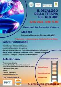 “Il decalogo della terapia del dolore”. È questo il titolo dell’importante incontro previsto per martedì prossimo, 22 febbraio, alle ore 17 presso il Chiostro di San Domenico a Cosenza.
